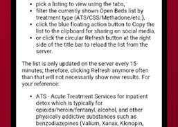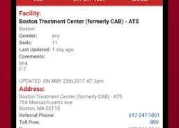 Opførelsen af åbne senge opdateres hvert 15. minut på MARSI -serverne, og derfor bør app’en højst være 15 minutter gammel inden for appen. Kun faciliteter, der er angivet på Massachusetts Behavioral Health Access -webstedet, er angivet. Det er heller ikke alle udbydere, der opdaterer deres sengetællinger med jævne mellemrum, så du skal altid ringe først, inden du går ind på et anlæg.