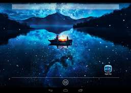 Froms-AppsAndGames: Night Tale Gratis Live Wallpaper giver en smuk nat landskab i blå farver. Båd ved flod eller sø nær bjergene. Romantisk atmosfære med lys på båden og en masse ildfluer rundt. Denne aften fortælling skaber behagelige udseende og skaber positive følelser. Store grafik, god funktionalitet og nem at bruge