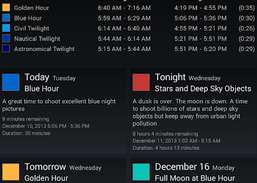 Finden Sie geeignete Wetter- und astronomische Bedingungen für Landschafts-, Natur-, Reise-, Outdoor-Fotografen und astronomische Beobachter. Das Programm ist der erweiterte Golden Hour-, Blue Hour-, Dusk-, Dawn-Rechner und vieles mehr. Must have für Profis, fortgeschrittene Amateure und einfach nur zum Spaß.