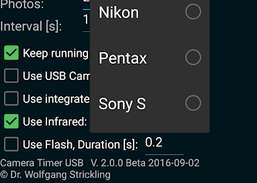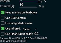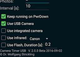 CameraTimer unterstützt den USB-Host-Modus von Android 3.X und höher. Ein spezielles USB-Host-Adapterkabel ist erforderlich. Für frühere Android-Versionen kann diese kleine App die eingebaute Flash-LED des Telefons verwenden, um externe elektronische Geräte freizugeben.