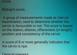Eine Gruppe von Messungen, die bei der internen Untersuchung durchgeführt wurden, um festzustellen, ob der Gebärmutterhals günstig ist oder nicht. Die Bewertung basiert auf der Station, Dilatation, Auslöschung (oder Länge), Position und Konsistenz des Gebärmutterhalses.