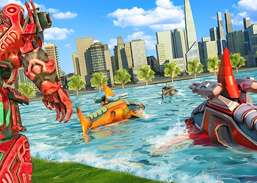 Der wahre Kampf zwischen dem wütenden Haisimulator und dem Roboterkrieger. Kriegerroboter greifen Simulator an ..
