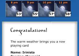 Weather Frog erkennt besondere Wetterphänomene und zeigt entsprechend eine passende Figur an. Zum Beispiel wird ein Troll angezeigt, wenn sich massive Regenfälle nähern, und ein Pixie für eine sternenklare Nacht. 20 verschiedene Figuren aus der Mythologie stehen für 20 besondere Wetterereignisse. Jede Figur kommt nur einmal vor, wird aber als Trophäe in der App gespeichert.