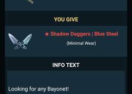 FromLuroid:Trade your CSGO Skins and get the Skins you always wanted. FEATURES: Create Trade offers and offer your skins for others- Favorite your trades for later- create trade offers within the app in Steam- check your Incoming trade offers- see the value of the SKINS (also total Offer/Want value) - share trade offers over the ''share button'' in the top right corner (Once you opened a trade offer) Sign in through Steam and select the Items you want and which items you will give from you inventory. Create a Trade offer fast and easy through Steam. Happy Trading.