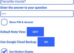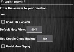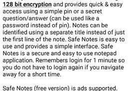 Safe Notes is a notepad application that stores your notes in a secure manner using 128 bit encryption and provides quick & easy access using a simple pin or a secret question/answer (can be used like a password instead of pin). Notes can be identified using a separate title instead of just the first line of the note. Safe Notes stores all your data on the device instead of uploading your personal information to the internet. Safe Notes is easy to use and provides a simple interface. Safe Notes is a secure and easy to use notepad application.