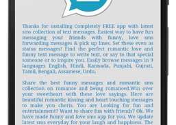 Helposti selata viestejä 8 kielellä Englanti, Hindi, Kannada, Punjabi, Gujarati, Tamil, Bengali, Urdu. Jaa paras hauska viestejä ja romanttinen SMS kokoelman romantiikkaa ja sitä romanced. Voittaa mielitietty näillä rakkaudella sanontoja. Tässä kaunis romanttinen suudella ja sydän koskettavan viestejä tehdä vaalia. Etsit hauskaa ja viihdettä? Olemme tehneet hauska ja rakkautta sms sovellus sinulle. Päivitämme uusin SMS jokapäiväisessä oman nauraa ja onnellisuutta. Kriittisin komponentti kenenkään on olla mukava ja niissä hieno asenne. Jokainen löytää jotain rentoutua ja piristää hieman. Paras ratkaisu rentoutuminen on nauraa Android-laitteissa. Tarjoamme SMS jakamisen järjestelmä Whatsapp ja Facebook heti myös voit päivittää omat suosikki SMS .