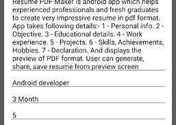 Le CV est la première impression lors de la recherche d'emploi. L'application Resume PDF Maker vous aidera à créer, créer, éditer et partager rapidement des CV au format professionnel au format pdf. Un CV professionnel est indispensable lorsque vous postulez pour un emploi, passez un entretien, recherchez un emploi, recherchez un emploi, postulez à un emploi sur un chantier, etc.