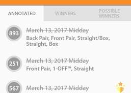 Actuellement, il prend en charge Pick 3, Cash 3, Daily 3, Play 3, DC 3, Pega 3, Pick 2 et Pega 2, mais de nombreux autres seront bientôt intégrés. Cette semaine, nous intégrerons le Pick 4, Cash 4, Daily 4, Play 4, DC 4, Pega 4 et la semaine prochaine, nous intégrerons le Pick 5, Cash 5, DC 5 et la loterie nationale Powerball et Megamillions.