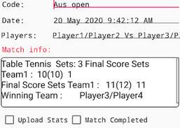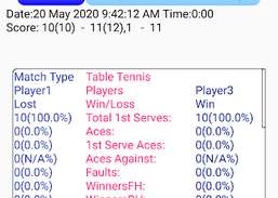 मैच के आँकड़ों को आँकड़े दर्शक स्क्रीन में मैच पूरा होने के बाद देखा जा सकता है और खेल के दौरान इनप्ले आँकड़े भी सहेजे और ईमेल किए जा सकते हैं। ऐप एकल और युगल दोनों खेलने की अनुमति देता है, गेम, सेट, टाई ब्रेकर के बाद स्वचालित रूप से समायोजन सर्वर और रिसीवर सेट करेगा (आप खिलाड़ियों की सेवा बटन पर क्लिक करके सर्वर और रिसीवर को मैन्युअल रूप से बदल सकते हैं। सेटिंग्स स्क्रीन डिफ़ॉल्ट के चयन की अनुमति देती है मैच सेट। खिलाड़ियों की स्क्रीन में उपयोगकर्ता परिभाषित खिलाड़ियों को उनके विवरण के साथ जोड़ा जा सकता है, जैसे क्लब, देश, दाहिने हाथ का खेल, प्रत्येक खिलाड़ी के बारे में टिप्पणी आदि प्रत्येक खिलाड़ी की नियुक्ति और विवरण बनाया जा सकता है और आवश्यक लोगों को भेजा जा सकता है। मानक स्कोरिंग सिस्टम लागू होता है। प्रत्येक गेम को 11 अंक (यदि 11 सभी पर बंधे हैं तो 2 अंक स्पष्ट), प्रति खिलाड़ी 2 सर्व करता है, 3 या 5 सेट का चयन किया जा सकता है।