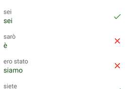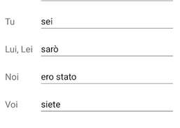 La data domanda include informazioni di riferimento e forme di oltre 7000 verbi italiani presentati in 15 tempi grammaticali. Inoltre, l'applicazione contiene un trainer integrato per una migliore memorizzazione delle parole. Inoltre, a seconda del tipo di percezione delle informazioni dell'utente, è possibile allenarsi in modalità scelta, scrittura o conversazione completamente gratuita e offline.