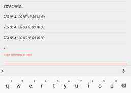 Eenmaal verbonden, kan de gebruiker elk ELM327 AT- of ST-commando (Scantool.nets alternatieve AT-commandoset) of hexadecimale OBDII-commando geven door het commando te typen en op de Send-toets op het toetsenbord te tikken. De app zal direct reageren met een reactie zoals te zien is in de screenshots. Antwoorden met meerdere regels worden automatisch opgemaakt in elk afzonderlijk antwoord, één per regel.