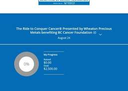 O passeio para conquistar o câncer BC é um evento de ciclismo exclusivo de dois dias para arrecadar dinheiro para pesquisas sobre o câncer. Nossa missão é clara - um mundo livre de câncer. O dinheiro arrecadado para o The Ride to Conquer Cancer BC apoiará médicos, cientistas e pesquisadores líderes, cuja busca por novas descobertas e melhores resultados para os pacientes terá um impacto real em nossas comunidades em todo o Canadá e ao redor do mundo. Em outras palavras, sua participação acelerará a conquista do câncer.