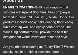 EN MULTI COAT SDN BHD — компания, поставляющая водостойкую напольную плитку. Наша компания находится в Таман Скудай Бару, Скудай, Джохор, Малайзия. Наша продукция включает полы с эпоксидным чешуйчатым покрытием, стены с эпоксидным чешуйчатым покрытием и эпоксидную гальку. Наш подрядчик по укладке напольной плитки предоставит лучший дизайн плитки, который будет соответствовать вашему вкусу и стилю.