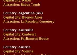 Alla världens länder och deras huvudstäder i alfabetisk ordning. ... Som huvudstäder i sina länder skiljer sig dessa speciella städer åt mycket när det gäller säkerhet, priser, hälsovård, föroreningsnivå och andra förhållanden, allt detta kallas livskvalitet. Vad är det bästa av dem att leva i? Världens främsta plats att bo på är den australiensiska huvudstaden Canberra, följt av kanadensiska Ottawa. För resor väljer de flesta turister Storbritanniens huvudstad London, det är den mest besökta staden i världen. Den andra är Bangkok och på tredje plats är det världsberömda Paris. Spela ett spännande pusselspel med överraskningsinformation om alla dessa gynnsamma huvudstäder i de mest populära länderna runt om i världen.