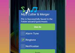 Mp3 skärare andamp; Merger är en Android-applikation som används för att klippa och sammanfoga mp3-filer."Är du en musikälskare? i så fall kommer du att älska den här applikationen"Du kan anpassa låtarna enligt dina önskemål"har du några favoritlåtar? slå ihop några av dina favoritlåtar med Igost Mp3 Cutter andamp; Merger "När du spelar en vald del av ljudet kan du se en indikatormarkör och automatisk rullande vågform. Du kan zooma den här vågen och klippa låten på den perfekta positionen du vill ha. IGOST Mp3 Cutter andamp; Fusionen innehåller: Mp3 Cutter. Mp3 Merger (Mp3 Fusion Maker). Mp3-spelare Genom att använda Mp3 Cutter andamp; Merger You Can: Klipp ut mp3-låtar och spara dem i mappen. /Igost/låtar. Slå samman två mp3-filer och gör en fusionslåt. Tilldela den som din enhets ringsignal, kontaktringsignal, meddelandesignaler etc. Funktioner inkluderar: Du kan skapa dina egna ringsignaler. du kan klippa och slå samman mp3-filerna med Mp3 Cutter andamp; Fusion. du kan skapa fusionslåtar. klippning och sammanslagning av den inspelade låten är möjlig. Efter att ha slagit samman en låt kan du höra den sammanslagna låten i spelaren. Applikationen kan flyttas till SD-kort. Efter att ha sparat den trimmade mp3:en får du alternativ för att använda den trimmade tonen som larmton, ringsignal, meddelande, tilldela kontakt och alternativ för att öppna utdatamappen. lagringsväg för både trimmad och sammanfogad mp3 nämns separat (sdcard/igost/music). Du kan komma åt både trimmade och sammanslagna mp3 från startsidemapparna (Trimmade tones andamp; Merged tones) i själva applikationen. För eventuella frågor och förslag kontakta oss på android@igosttech.com.