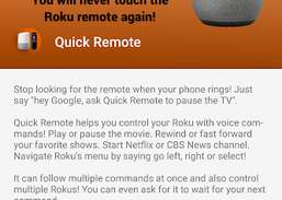 Quick Remote hjälper dig att styra din Roku med röstkommandon! Spela upp eller pausa filmen. Spola tillbaka eller framåt dina favoritprogram. Starta Netflix eller CBS News kanal. Navigera i Rokus meny genom att säga gå vänster, höger eller välj!